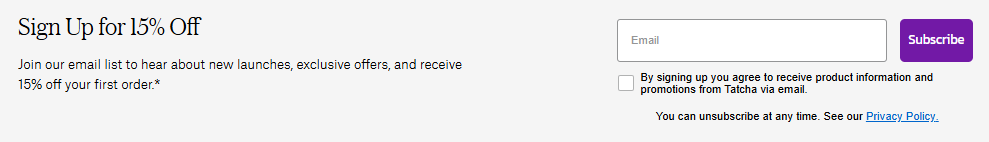 You will receive a welcome email from us with a unique code enclosed offering 15% off your first purchase. The welcome code cannot be used in conjunction with any other promotional code or offer and can be only used at Tatcha.co.uk. Not redeemable on mini or travel sizes. Stock subject to availability. Promotions, gifts with purchases and discounts cannot be combined.
